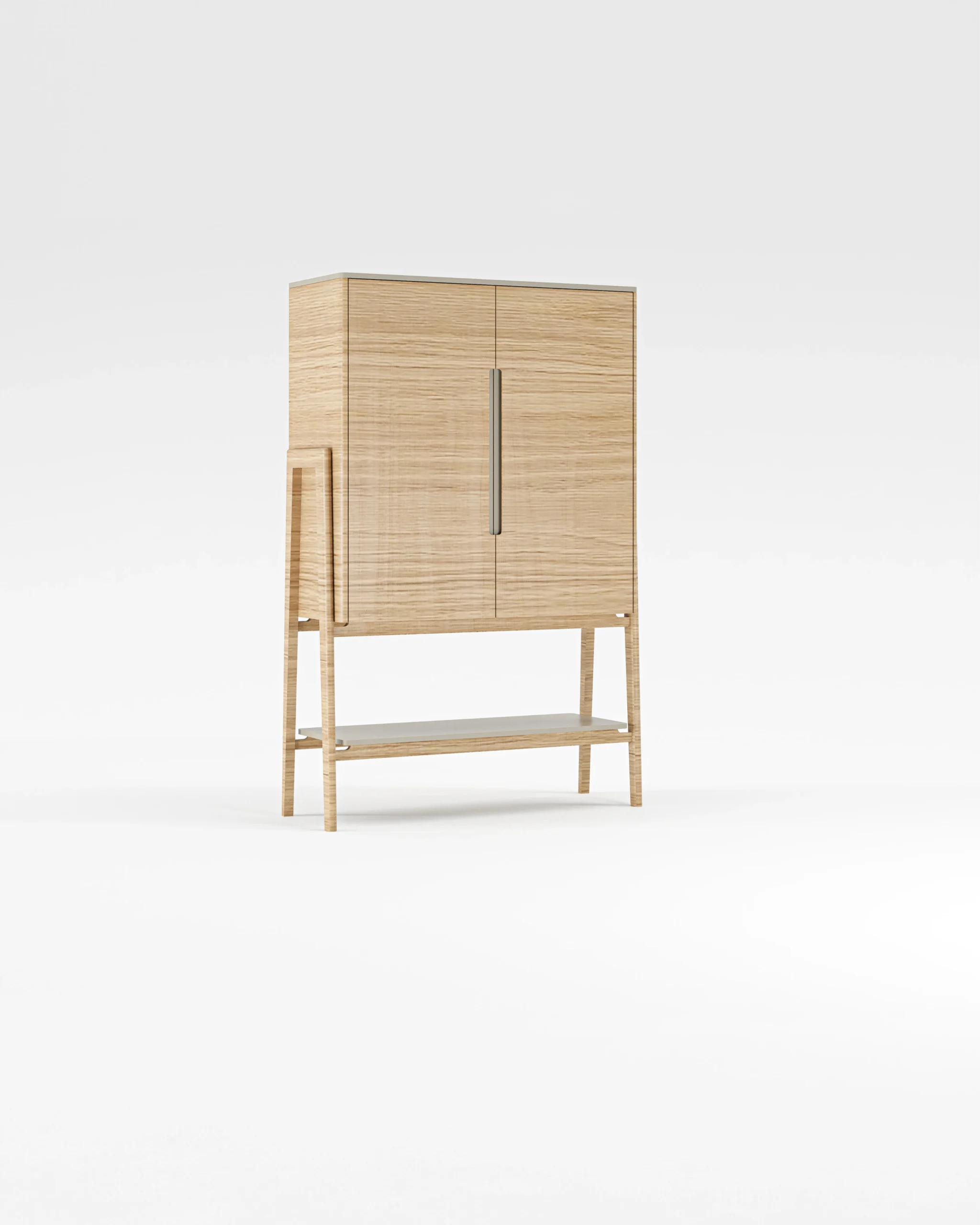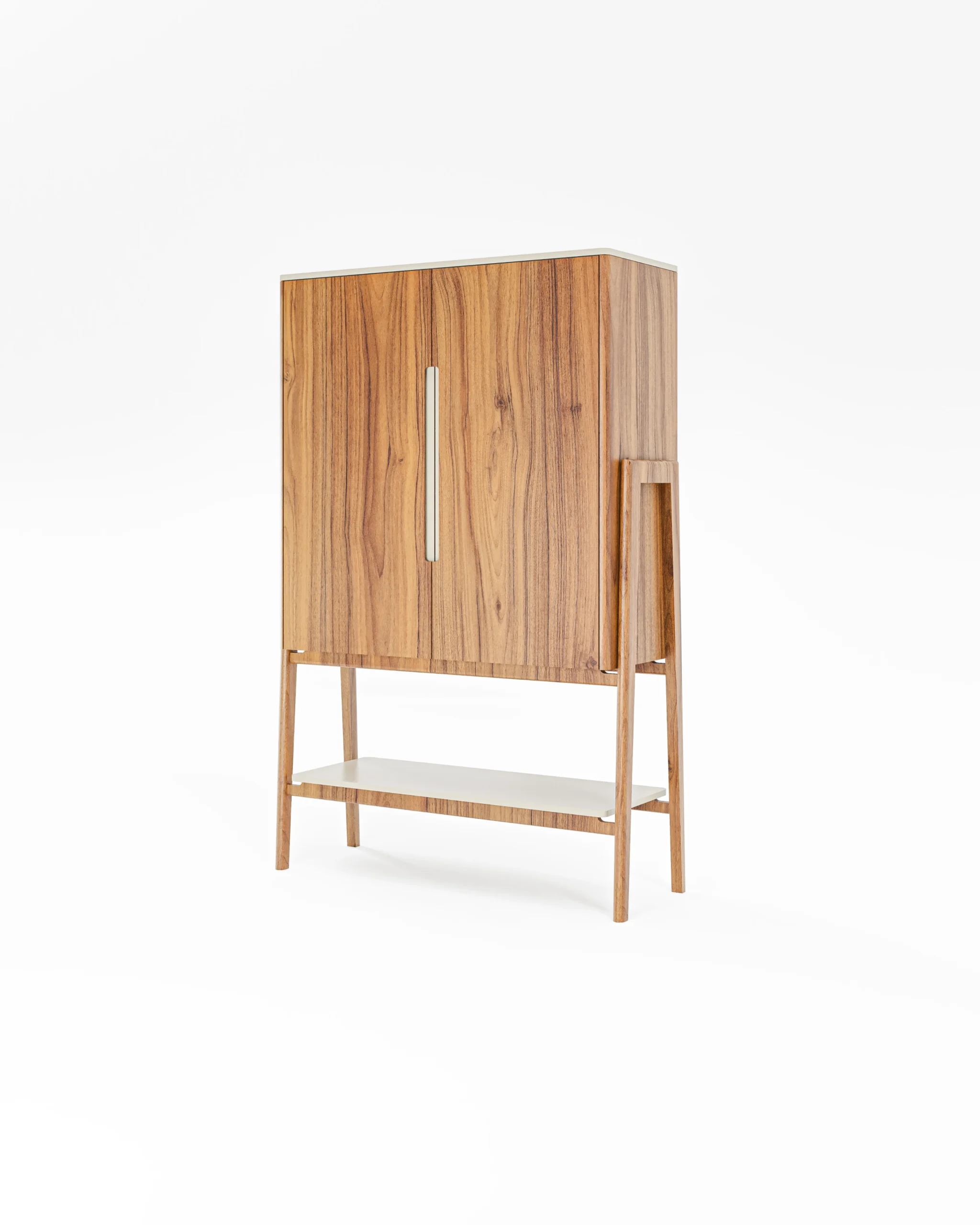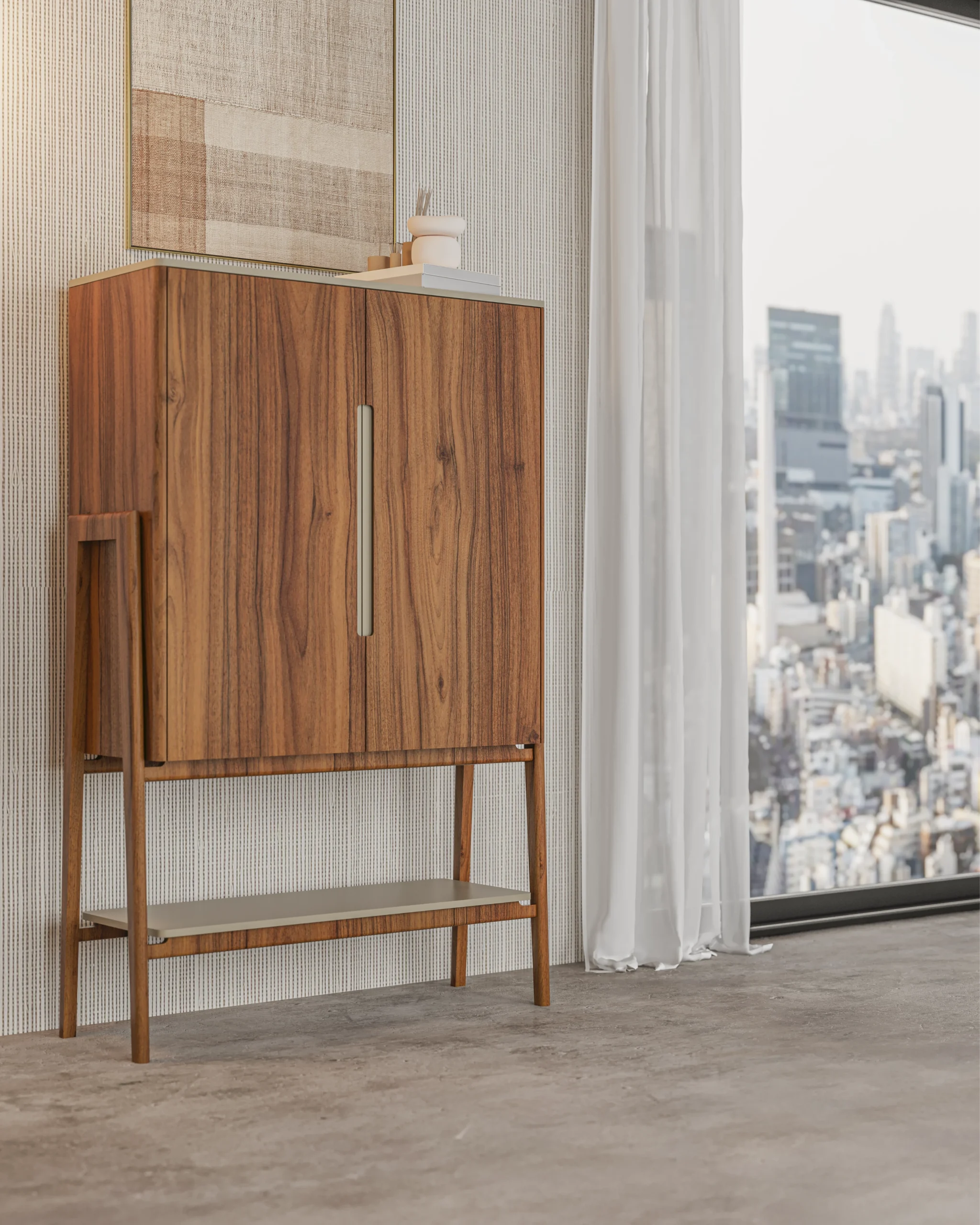 O Móvel Bar Bicca em é uma peça elegante e funcional, com estrutura elevada, prateleira inferior e puxadores integrados. Um complemento sofisticado para ambientes sociais com estilo escandinavo ou contemporâneo.