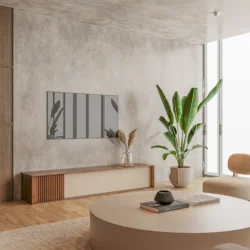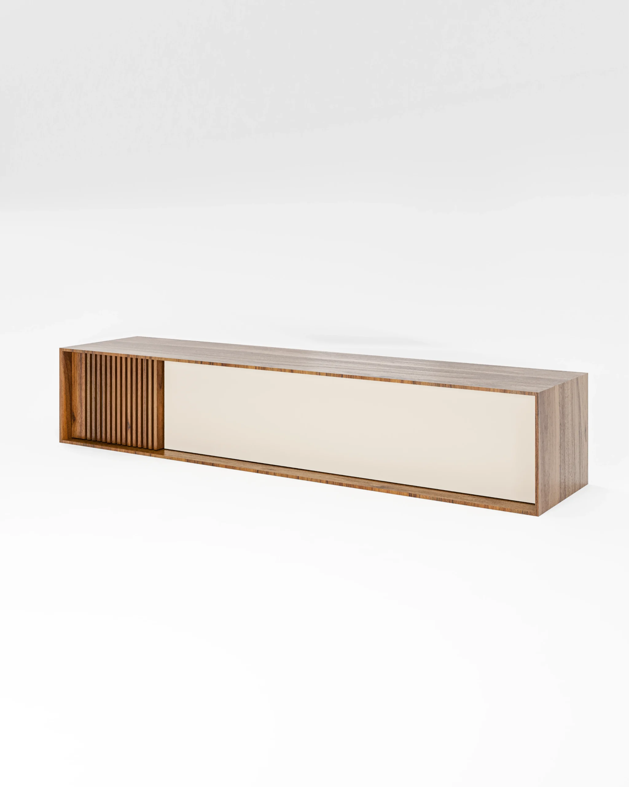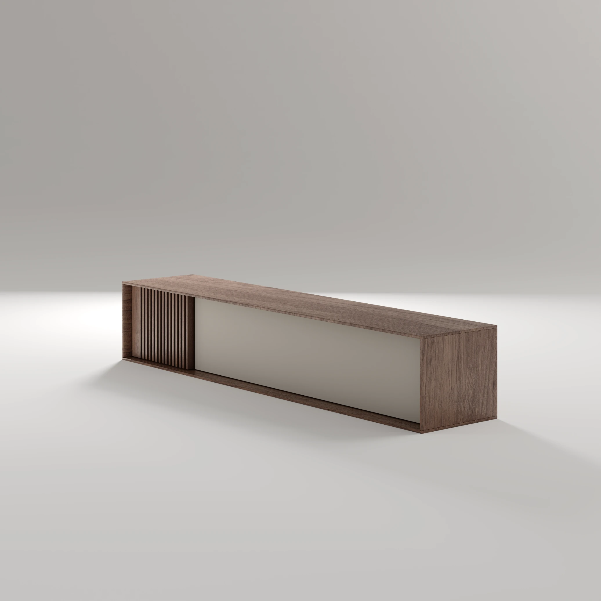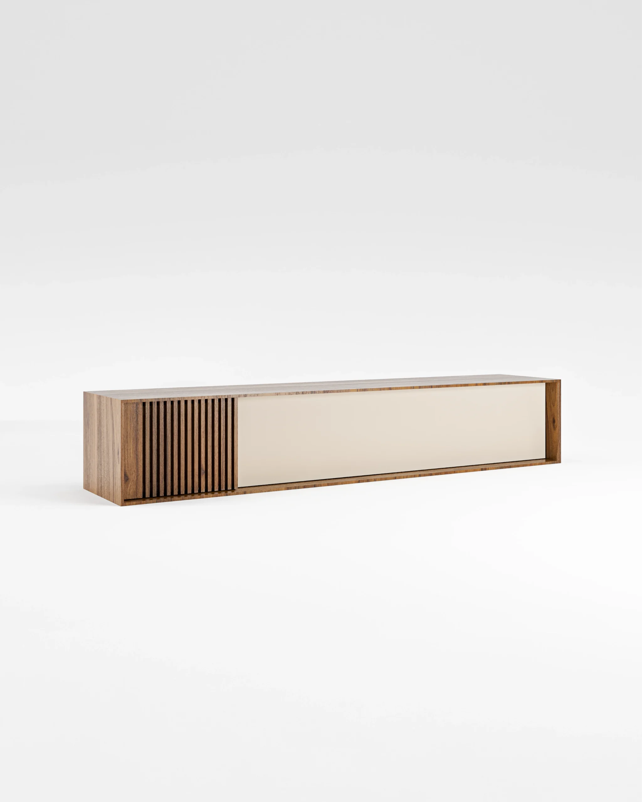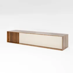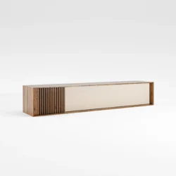 O móvel de tv Brict destaca-se pela presença marcante do ripado vertical em uma das extremidades — detalhe que traz textura, profundidade e uma assinatura visual sofisticada ao ambiente. Com um design baixo, perfeito para composições modernas, este móvel possui uma ampla porta rebatível frontal, que oferece espaço generoso para armazenar alguma peça.