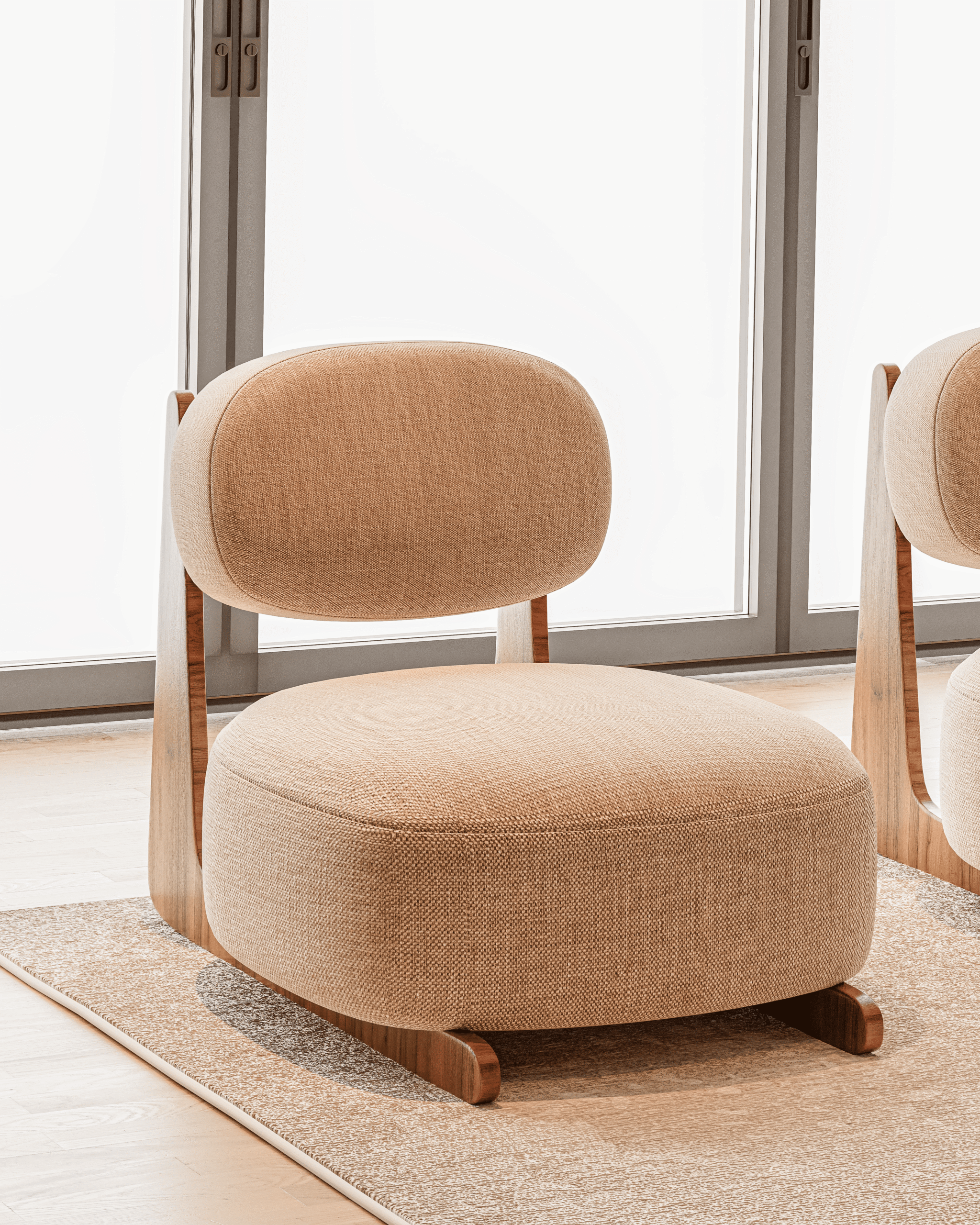 A Poltrona Tala é a definição de conforto com design autoral. O seu assento generoso e encosto oval proporcionam uma experiência acolhedora, perfeita para ambientes que pedem tranquilidade e sofisticação. O grande diferencial da peça está na sua base em madeira com design curvo, que substitui os pés tradicionais por dois apoios amplos em formato arqueado.